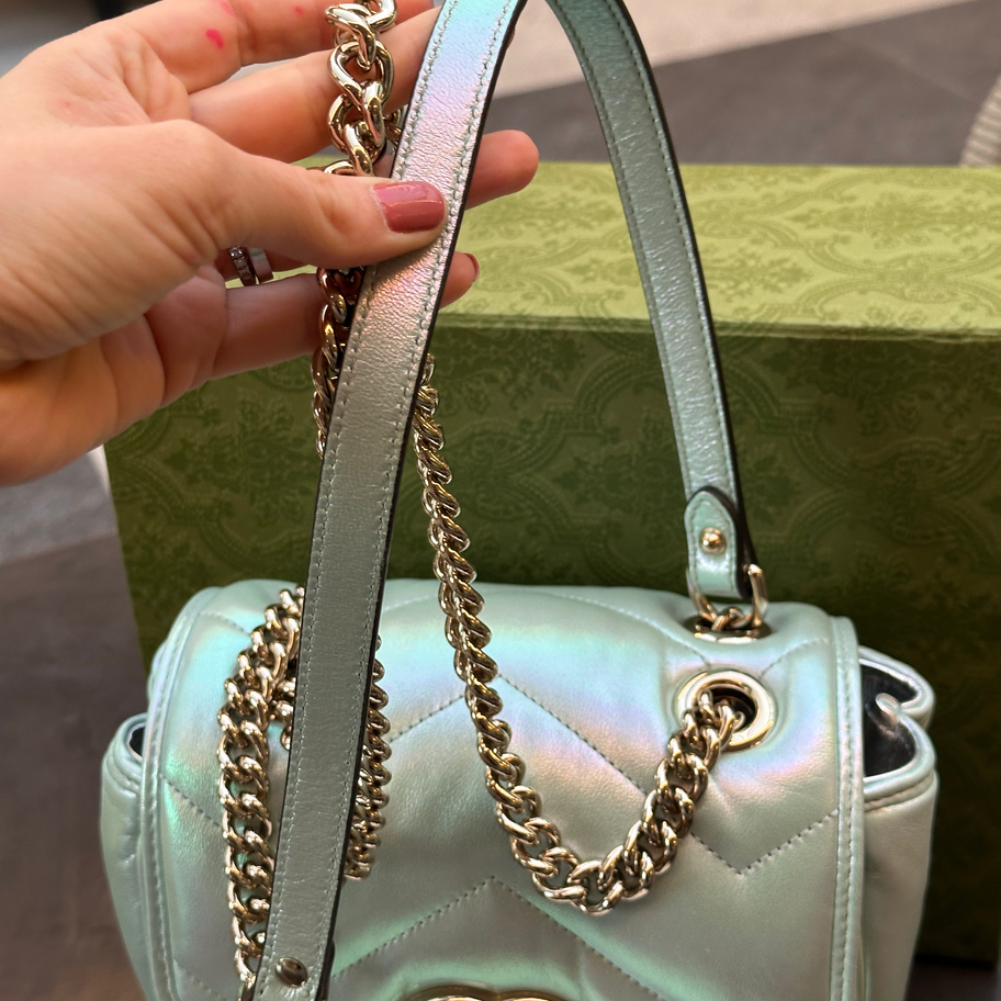 Esta deslumbrante Gucci em pele acolchoada verde iridescente dará um toque de elegância de designer a qualquer look. Abre com um fecho de encaixe fácil e seguro, com um luxuoso forro de seda verde iridescente. Espaço aberto com um bolso deslizante em pele.